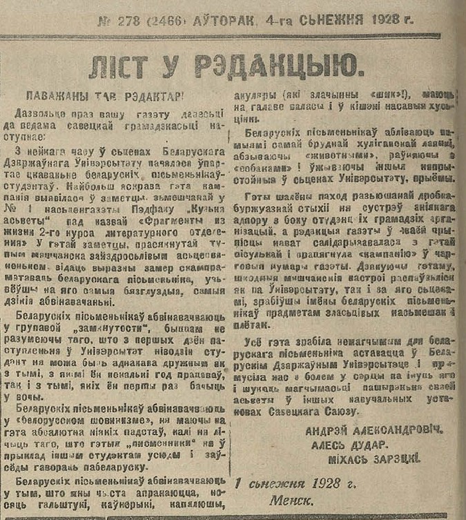 Асабліва востра яна адчувалася ў сценах Беларускага дзяржаўнага універсітэта. У аўторак, 4-га снежня 1928 года, у 278 нумары „Савецкай Беларусі” на апошняй старонцы з’явіўся ліст у рэдакцыю за подпісам Андрэя Александровіча, Алеся Дудара і Міхася Зарэцкага: «Паважаны таварыш рэдактар, дазвольце праз вашу газэту давесьці да ведама савецкай грамадзкасьці наступнае. Зь нейкага часу ў сьценах Беларускага дзяржаўнага ўніверсітэту пачалося ўпартае цкаваньне беларускіх пісьменьнікаў-студэнтаў /…/ Беларускіх пісьменьнікаў абвінавачваюць у групавой замкнутасьці, /…/ у „белорусском шовинизме”, /…/ у тым, што яны чыста апранаюцца, носяць гальштукі, каўнерыкі, капялюшы, акуляры /…/ Беларускіх пісьменнікаў абліваюць памыямі самай бруднай хуліганскай лаянкі, абзываючы „животными”, раўняючы з „собакамі” і ўжываючы іншыя няпрыстойныя ў сьценах Універсітэту прыёмы. /…/ Усё гэта зрабіла немагчымым для беларускага пісьменьніка заставацца ў Беларускім Дзяржаўным Універсітэце і прымусіла нас з болем у сэрцы пакінуць яго і шукаць магчымасьці пашырэньня сваёй асьветы ў іншых навучальных установах Савецкага Саюзу».