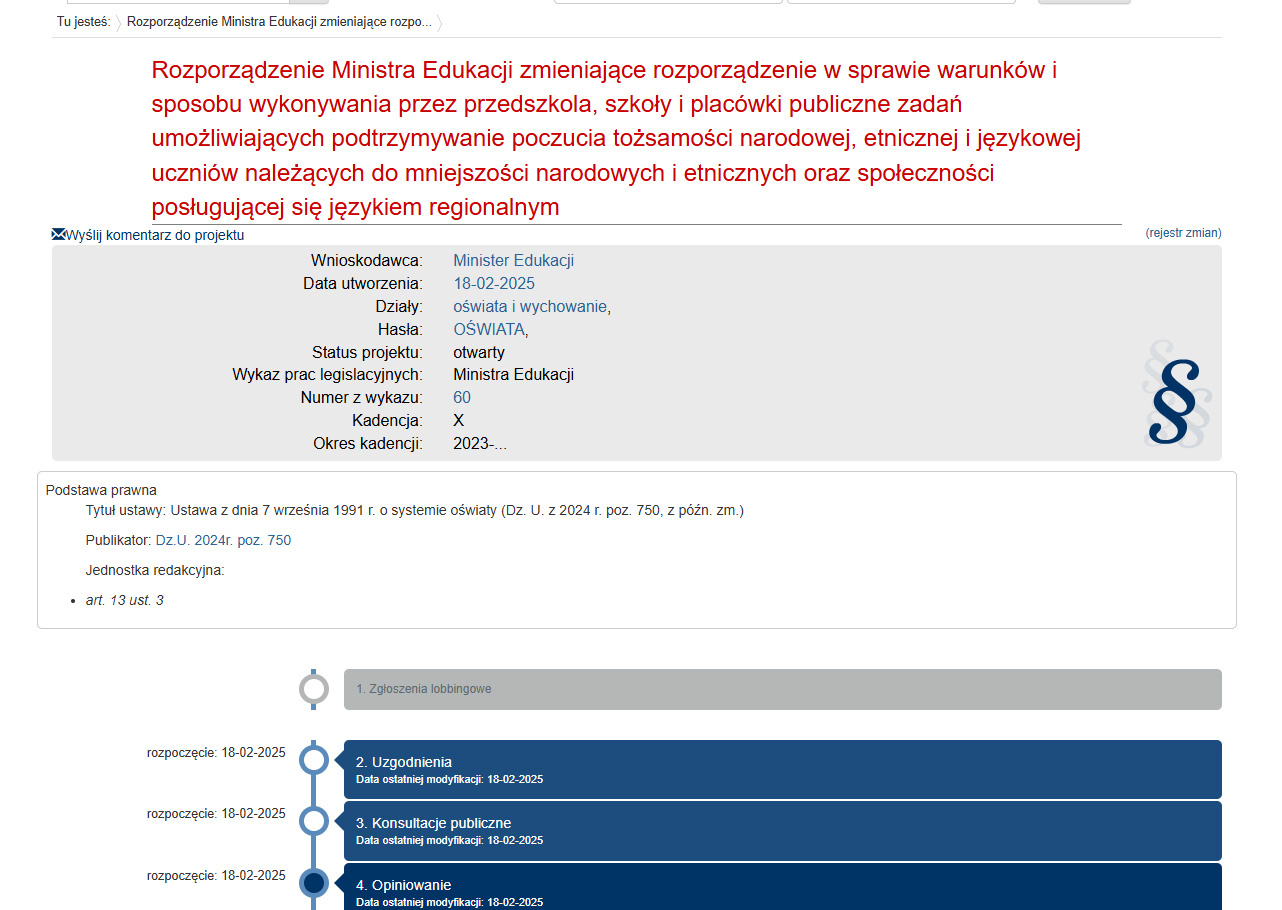 Jeszcze w lutym na stronie Rządowego Centrum Legislacji został opublikowany projekt nowelizacji rozporządzenia ministra edukacji w sprawie warunków i sposobu wykonywania przez przedszkola, szkoły i placówki publiczne zadań umożliwiających podtrzymywanie poczucia tożsamości narodowej, etnicznej i językowej uczniów należących do mniejszości narodowych i etnicznych oraz społeczności posługującej się językiem regionalnym. Ma to związek z zakwestionowaniem przez władze oświatowe zapisów w statutach liceów „białoruskich” w Bielsku i Hajnówce o obowiązkowej nauce języka białoruskiego przez wszystkich uczniów, kończącej się egzaminem maturalnym. Spór pojawił się w 2023 r., gdy część rodziców uczniów obu ogólniaków złożyła oświadczenia o rezygnacji z tego przedmiotu. Zgodę na to dało kuratorium, mimo że tamtejsza społeczność szkolna oraz organizacje białoruskie odebrały to jako cios w wieloletnią tradycję tych placówek, służącą podtrzymywaniu tożsamości swojej mniejszości. Wskazywano, że regulujące te kwestie rozporządzenie ministra edukacji jest nieprecyzyjne.